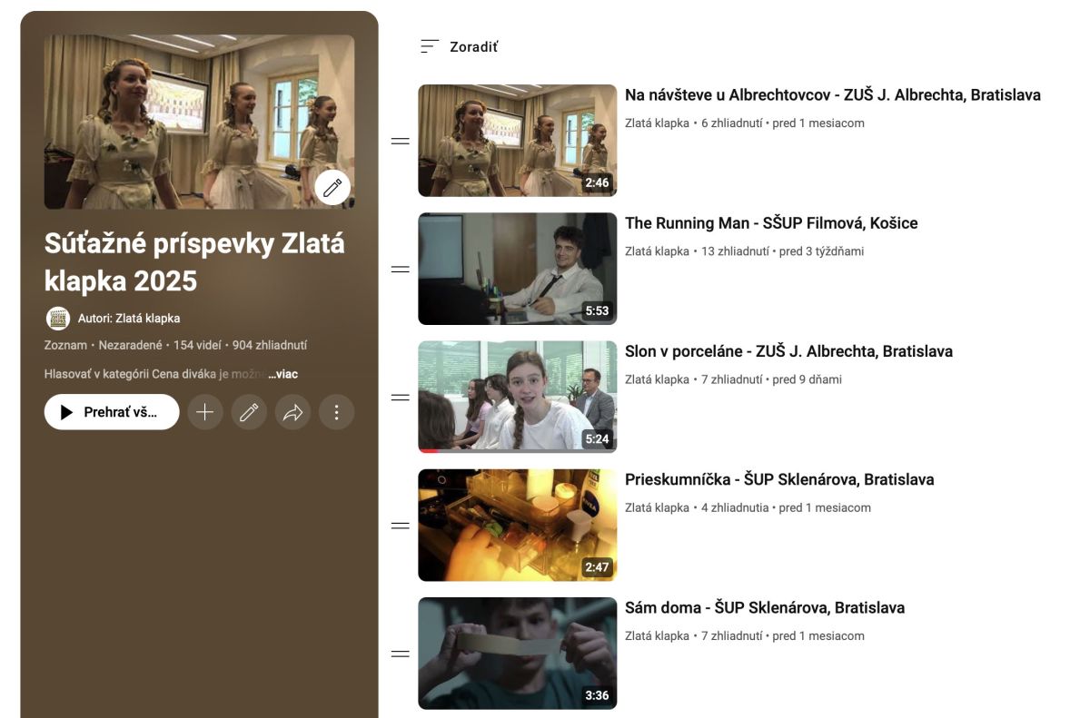 Výsledok hlasovania bude vyhlásený na galavečeri Zlatej klapky a následne na webe ZUŠ Jána Albrechta a Zlatej klapky. Ak si ich chcete pozrieť všetky, rezervujte si viac ako 10 hodín. Toľko majú dokopy všetky súťažné príspevky, ktoré vytvorili žiaci z celého Slovenska. Playtilst nájdete tu: https://www.youtube.com/playlist?list=PLCeWr2HydmaOQa5avqfD4FTdkzyIrJLZx